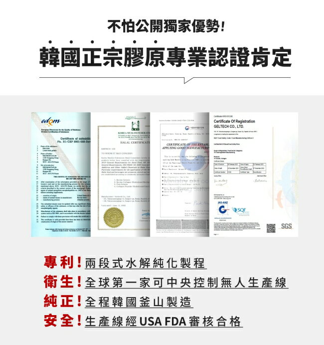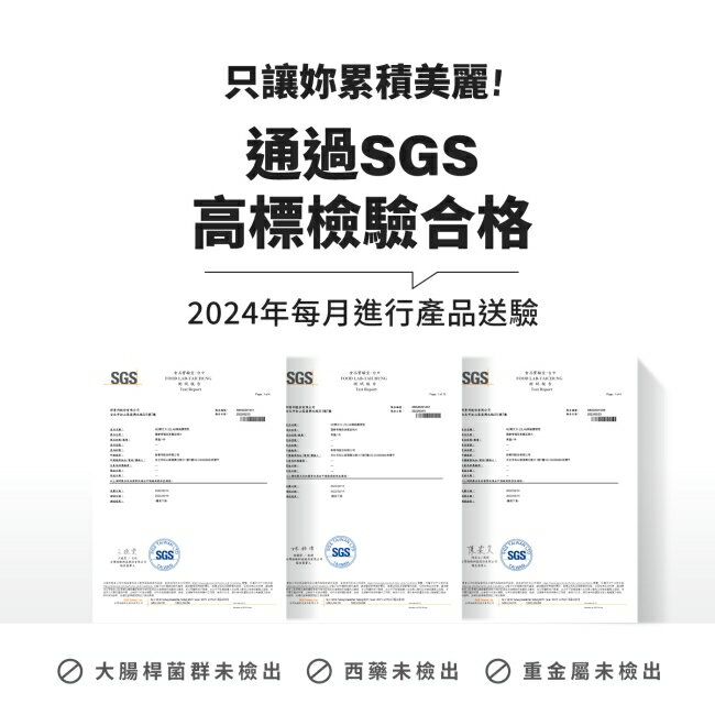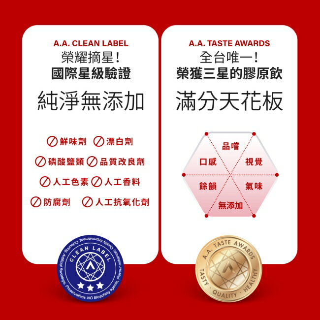 膠原系列飲品通過「A.A. Clean Label國際無添加認證」,以及國家SGS檢測,保證不使用甜味劑、香料、糖分、雌激素…等,超過815項月月檢測,以最安心的等級給予大家美麗補給。