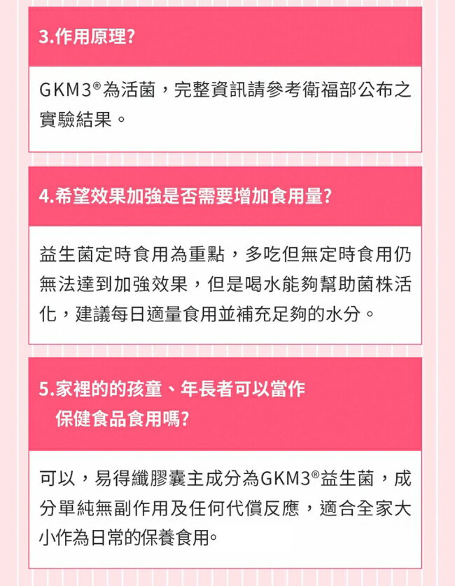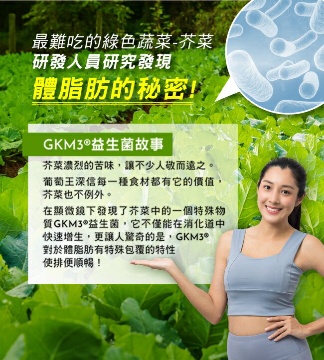 內容物:微結晶狀α-纖維素、植物乳桿菌Lactobacillus plantarum GKM3® 、硬脂酸鎂、二氧化矽