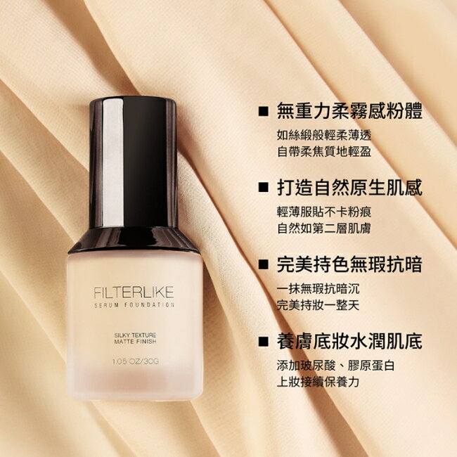 商品簡述 柔紗精粹粉底液,帶給你完美底妝體驗!輕薄質地融入肌膚,呈現無瑕妝感。