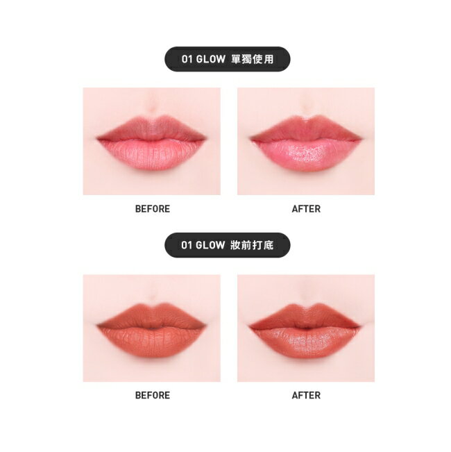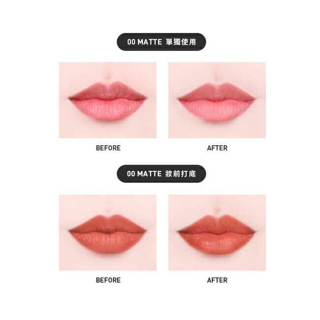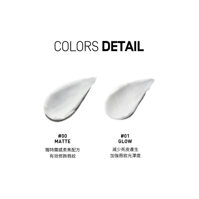 推出「00 Matte / 01 Glow」霧面及亮面兩種質地,提供柔焦及光澤雙選擇,皆添加玻尿酸保濕精華,滋潤雙唇且有效修飾唇紋。