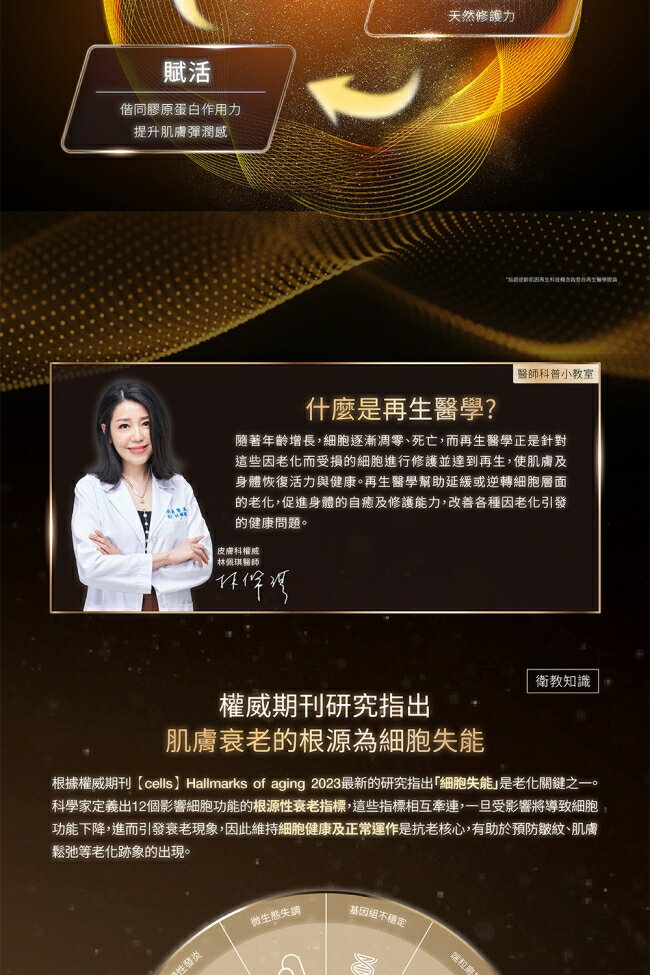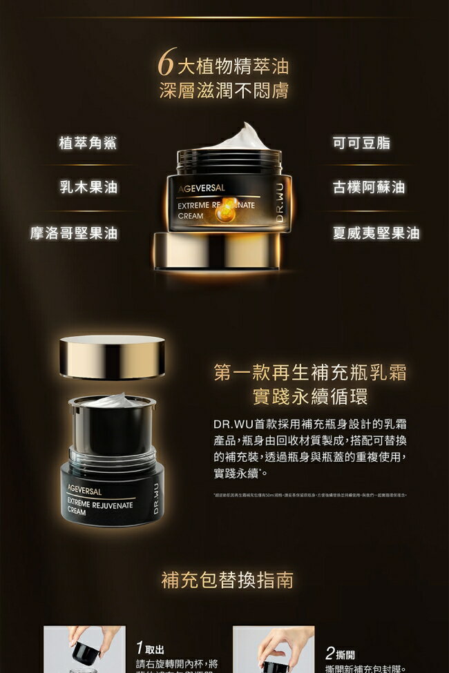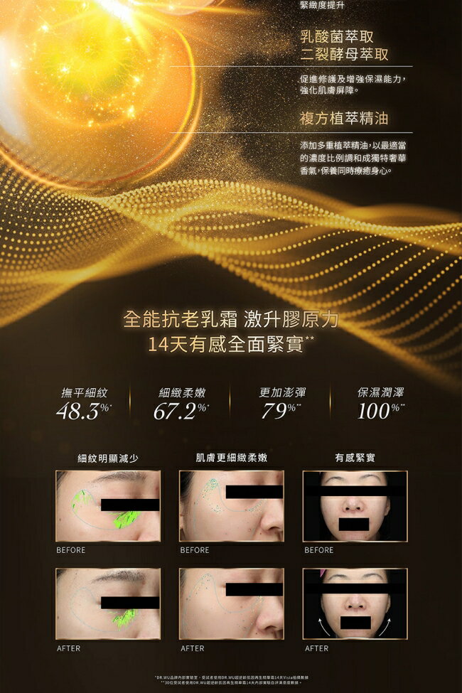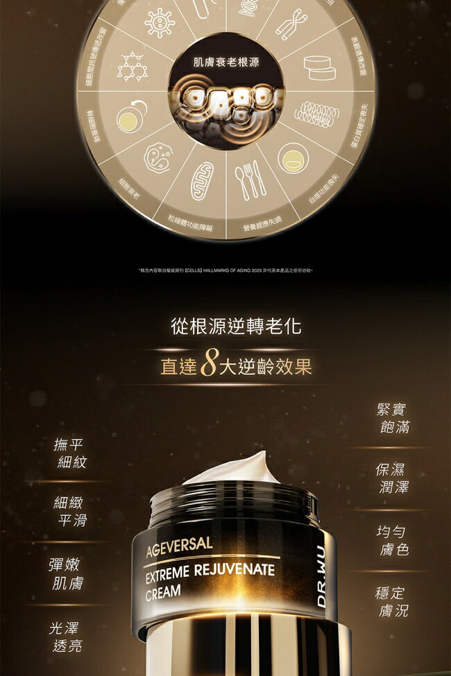 再生科技AGEVERSAL 全面啟動肌因年輕從根源改善老化問題有效撫平細紋、提升彈性、緊實飽滿、保濕潤澤使肌膚細緻平滑。全能抗老乳霜透過煥新-修復-賦活三大機制從根源全面性抗老解決與預防老化現象達到八大抗老功效還原肌膚年輕狀態全面提升肌膚的彈性與厚度達到深層滋潤不悶膚的效果使肌膚呈現飽滿光澤。質地豐潤滑順好推勻。