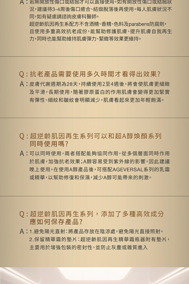 A: 可以同時使用,兩者搭配能夠協同作用,從多個層面同時作用於肌膚,加強抗老效果;A醇容易受到紫外線的影響,因此建議晚上使用。在使用A醇產品後,可搭配AGEVERSAL系列的乳霜或精華,以幫助修復和保濕,減少A醇可能帶來的刺激。
