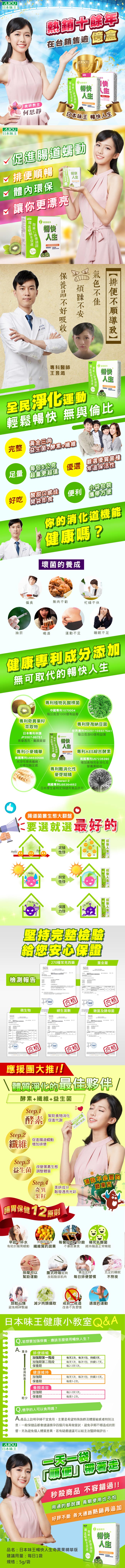 成分: 複合乳酸菌粉{乳糖醇(甜味劑)、氧化鎂、砂糖、乳酸菌粉【專利植物乳酸桿菌Lactobacillus plantarum (麥芽糊精、乳酸菌、乳糖、微結晶狀α-纖維素、甘油)、比菲德氏龍根菌粉Bifidobacterium longum(比菲徳氏龍根菌粉、玉米來源可溶性纖維)、芽孢乳酸菌粉Lactobacillus sporogenes(芽孢乳酸菌粉、麥芽糊精)、專利芽孢納豆菌粉Bacillus subtilis(芽孢納豆菌粉、麥芽糊精)】、羧甲基纖維素鈉}、綜合消化酵素粉{乳糖醇(甜味劑)、氧化鎂、砂糖、羧甲基纖維素鈉、專利AES綜合消化酵素粉【黃豆發酵萃取物(蛋白質分解酶、澱粉分解酶、脂解酶、纖維分解酶)、乳酸鈣、檸檬酸鎂、甘胺酸鋅、葡萄糖酸錳】}、砂糖(砂糖、二氧化矽)、菊糖、即溶奇異果果汁粉【砂糖、奇異果果汁粉(奇異果濃縮汁、麥芽糊精、辛烯基丁二酸鈉澱粉、砂糖)、辛烯基丁二酸鈉澱粉、檸檬酸、玉米澱粉、檸檬酸鈉、奇異果香料、黃槴子色素、槴子藍色素】、乳糖、氧化鎂(氧化鎂、砂糖、羧甲基纖維素鈉) 、專利難消化性麥芽糊精(膳食纖維)、檸檬酸、異麥芽寡糖、專利小麥精華(水溶性膳食纖維)、奇異果香料粉【辛烯基丁二酸鈉澱粉、麥芽糊精、奇異果香料、β-環狀糊精、脂肪酸甘油酯、維生素E(抗氧化劑)】、木寡糖、專利奇異果籽萃取物(糊精、奇異果籽萃取物)、果膠【果膠(柑橘)、蔗糖】