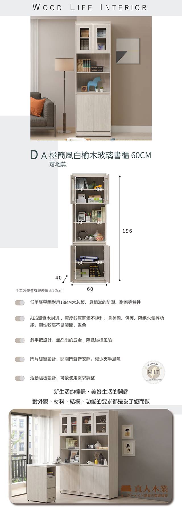 【直人木業】DA極簡風白榆木玻璃書櫃60公分(落地款)