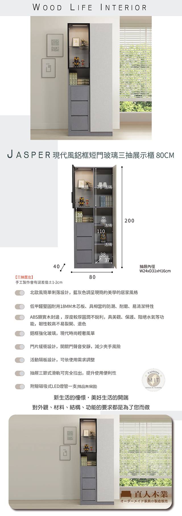 【直人木業】JASPER現代風鋁框短門玻璃三抽展示櫃80公分(三抽置左)