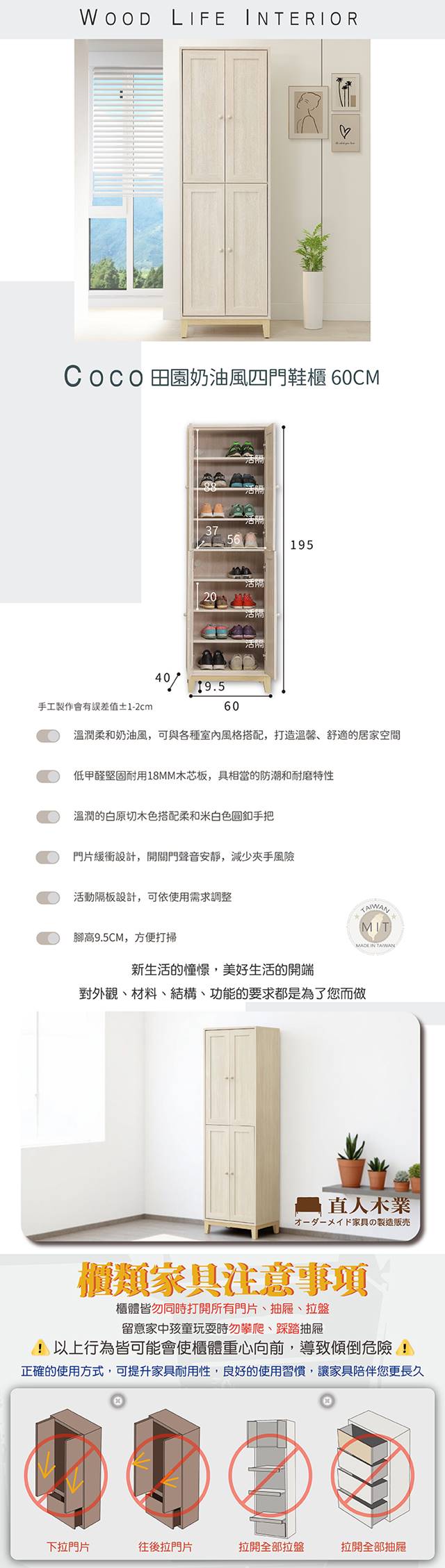【直人木業】COCO田園奶油風四門鞋櫃60公分