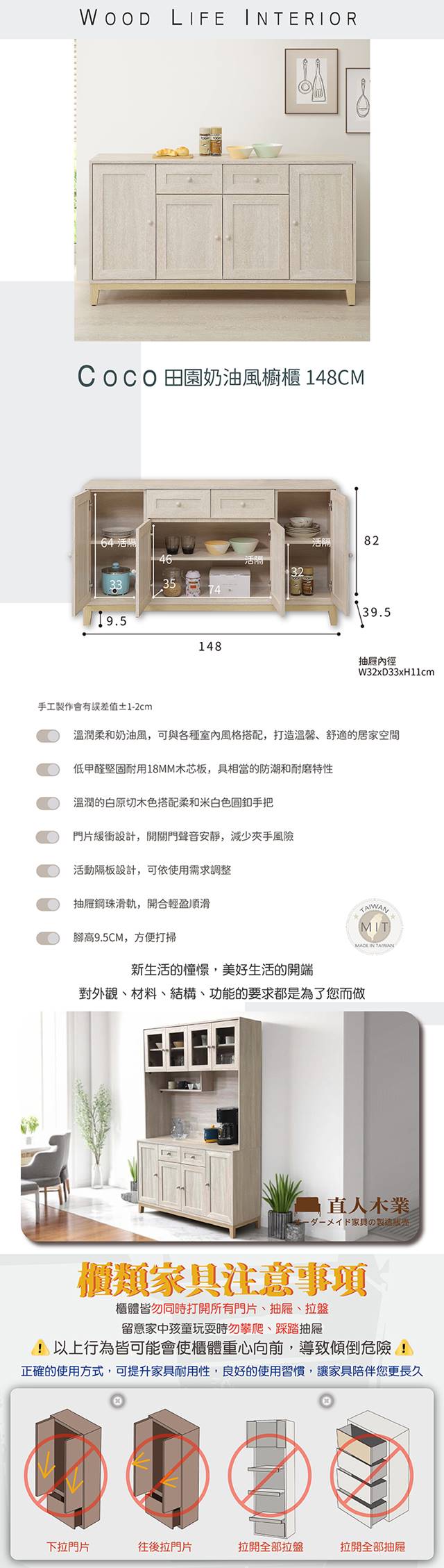 【直人木業】COCO田園奶油風櫥櫃148公分