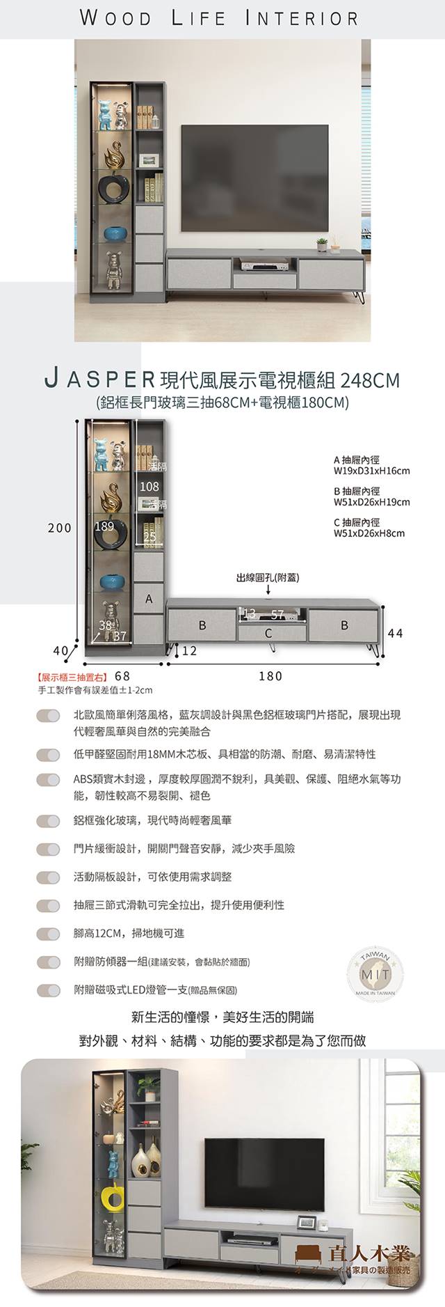【直人木業】JASPER現代風展示電視櫃組248公分(展示櫃三抽置右68公分+電視櫃180公分)