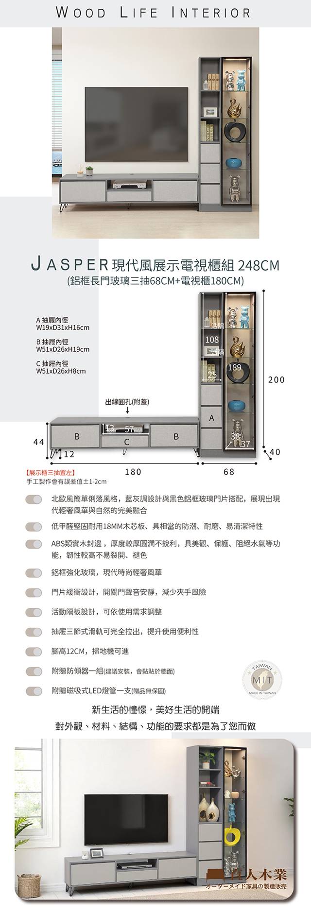 【直人木業】JASPER現代風展示電視櫃組248公分(展示櫃三抽置左68公分+電視櫃180公分)