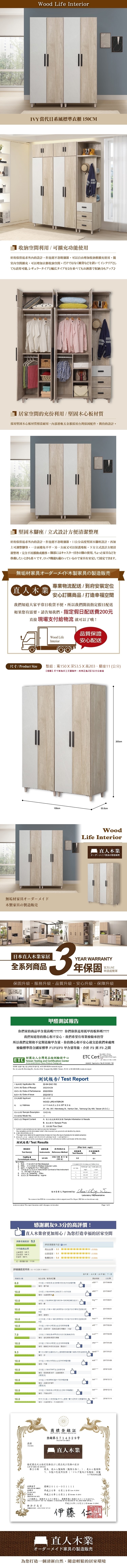 IVY當代日系風150公分標準衣櫃|日本直人木業家具限定優惠首選推薦,衣櫃全系列MIT台灣製作品質保證,提供平、假日安心配送到府組裝服務,日系、簡約、北歐、工業...多種衣櫃風格家具任選搭配出溫潤舒適的質感居家,穩固設計結構木作家具,採用符合國家標準低甲醛板料製作衣櫃,讓您居家煥裝打造更安心。