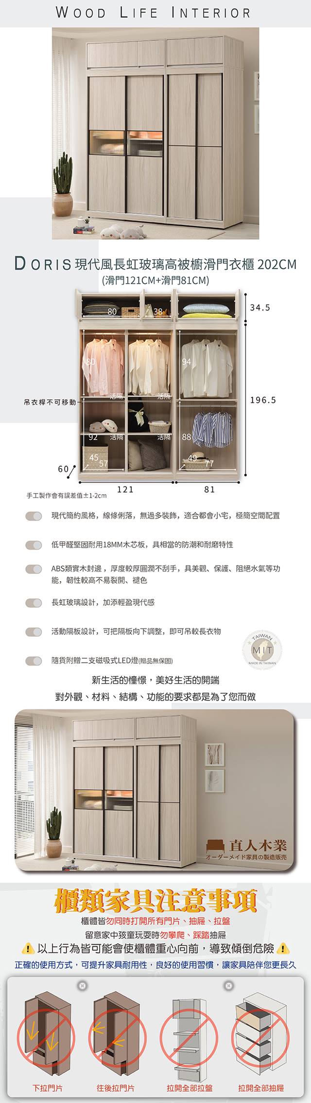 【直人木業】DORIS現代風長虹玻璃滑高被櫥門衣櫃202公分