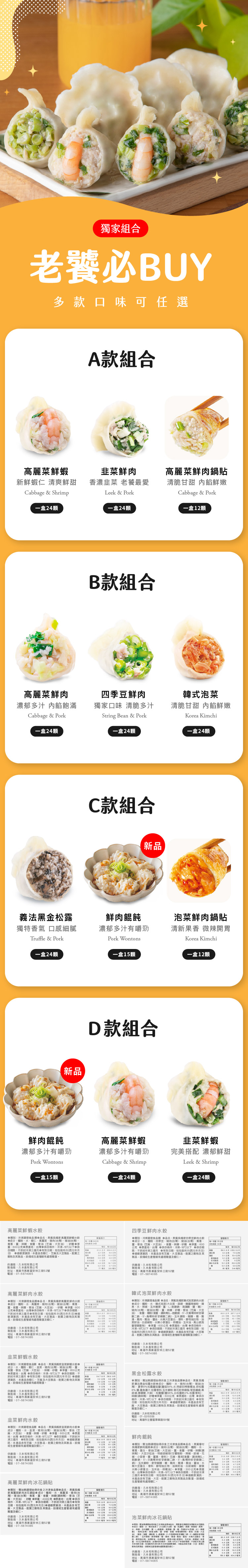 D:頂級干貝水餃、韭黃鮮蝦水餃、泡菜鮮肉鍋貼