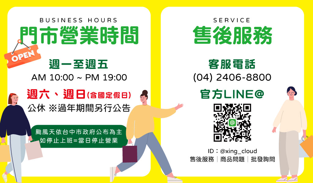 服務時間: 👉周一至周五 早上10:00~晚上19:00 👉周六、周日(含國定假日) 公休 颱風🌀依台中市政府公告(停止上班=休假) 🧧農曆過年期間,請依公告為主 客服電話:04-24068800 客服信箱:m84m05m15m@yahoo.com.tw