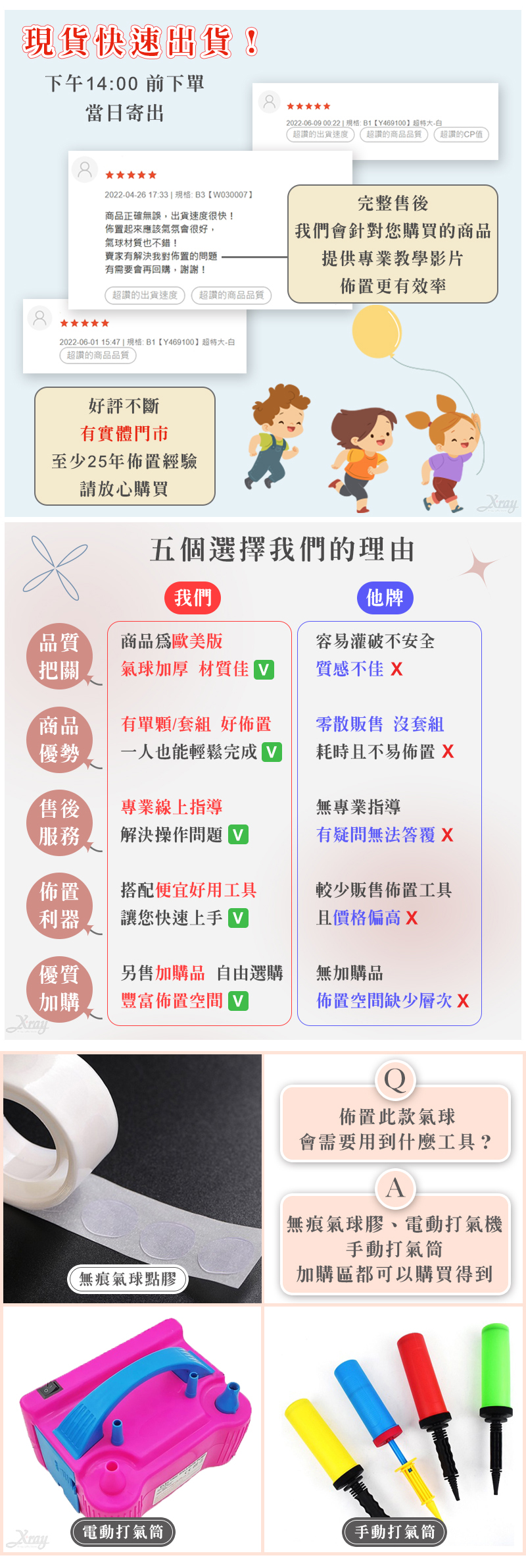 A 33754170002~33754170014 337 ●材料:天然乳膠 ●內容物:一入 ※使用打氣筒請小心使用,請勿大力推。氣球充氣時,請勿充太飽,建議充到8分飽,否則容易造成破損。 ※氣球盡量避免太陽高溫曝曬、尖銳物品、過度摩擦、擠壓拍打、充氣量過飽等都會使氣球容易破裂。 ※氣球可能約有3%破損率,因無法充氣一一檢視是否有瑕疵,還請見諒。