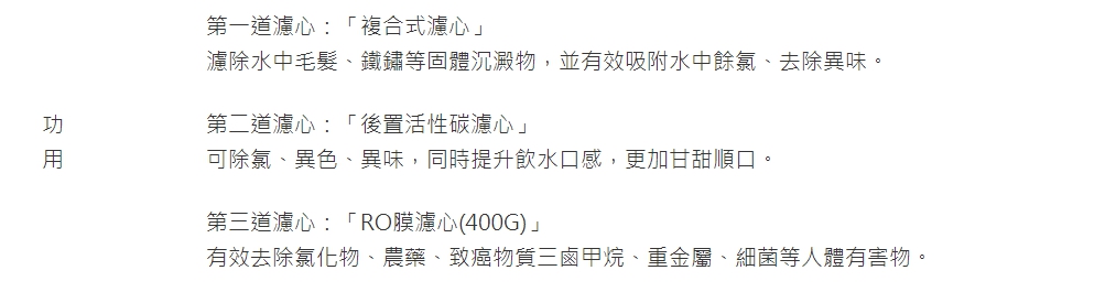 第一道:F0161「複合式濾心」X4 成份:聚丙烯+活性碳纖維 第二道:F0151「後置活性碳濾心」X2 成份:椰殼顆粒活性碳 第三道:F0181「RO膜濾心(400G)」X1 成份:逆滲透薄膜