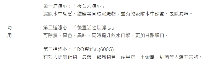 成分/支數 第一道:F0161「複合式濾心」X6 成份:聚丙烯+活性碳纖維 第二道:F0151「後置活性碳濾心」X2 成份:椰殼顆粒活性碳 第三道:F0182「RO膜濾心(600G)」X1 成份:逆滲透薄膜