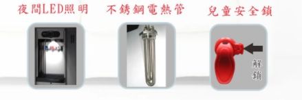 採用國內大廠大同牌壓縮機,品質穩定。 加熱器採用不鏽鋼316材質,無須電鍍層保護,飲水無汙染,安心又環保 水龍頭為不鏽鋼304材質,無電鍍重金屬汙染,並設有熱水安全鎖扣,預防孩童誤取熱水燙傷,喝的健康安全。 熱鋼及儲水桶均採用不鏽鋼304材質,無塑化劑疑慮。 溫水經煮沸後冷熱交換冷卻,不喝生水,並將熱能回收,衛生省能。 採用晶片式微電腦控制系統,控制精準、品質穩定。 面板附取水照明LED燈,省電方便夜間使用 熱水龍頭防燙設備避免小孩玩耍燙傷 溫度控制器,LED數字顯示