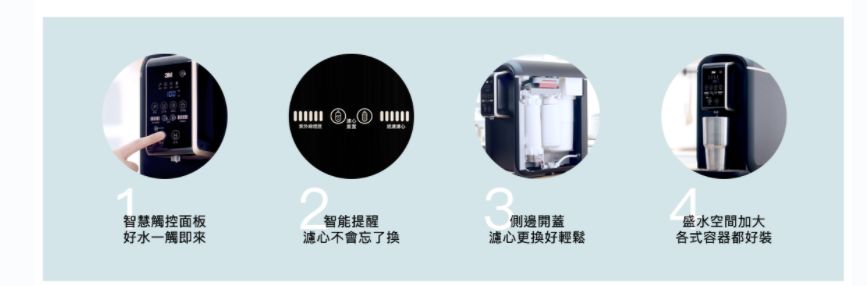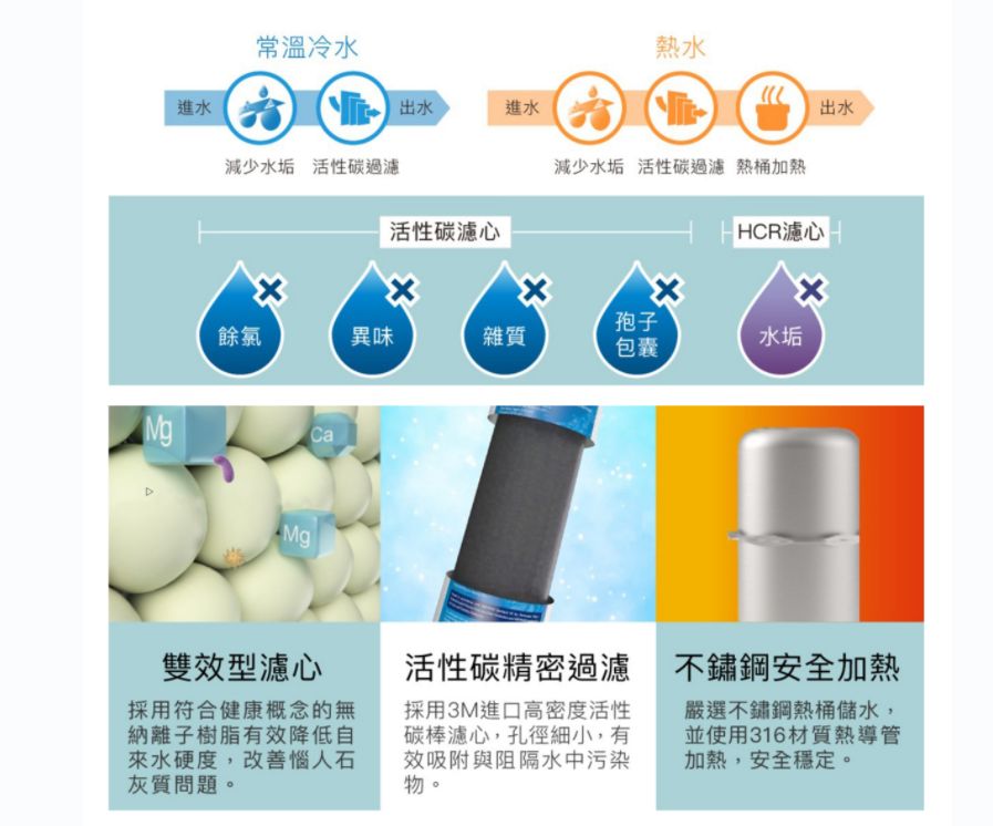 適合4人以上大家庭,冷熱出水皆經過濾淨,飲用與沖調食物飲品皆宜 整合離子交換軟水技術,雙道濾淨,減少水垢,即開即飲 經SGS檢驗測試,可有效濾淨部分水中有機物、有害重金屬等汙染物 活性碳濾心通水後可使用12個月(總濾水量7,571公升),不須頻繁更換濾心 智慧觸控面板,操作便利,可知道何時需更換濾心 加大式盛水空間設計,可接受較大容器裝載熱水
