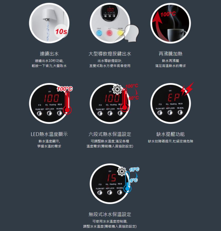 顯示功能:LED數位熱水顯示燈 控制功能:連續出水鍵、再沸騰功能、電磁閥控制出水 保護功能:漏電斷路器、液位防止空燒設計、熱水鎖定安全鍵、漏水偵測 補水功能:全自動補水加熱 優雅設計:全機鏡面烤漆 熱缸採用不銹鋼材質,飲水更安心有保障