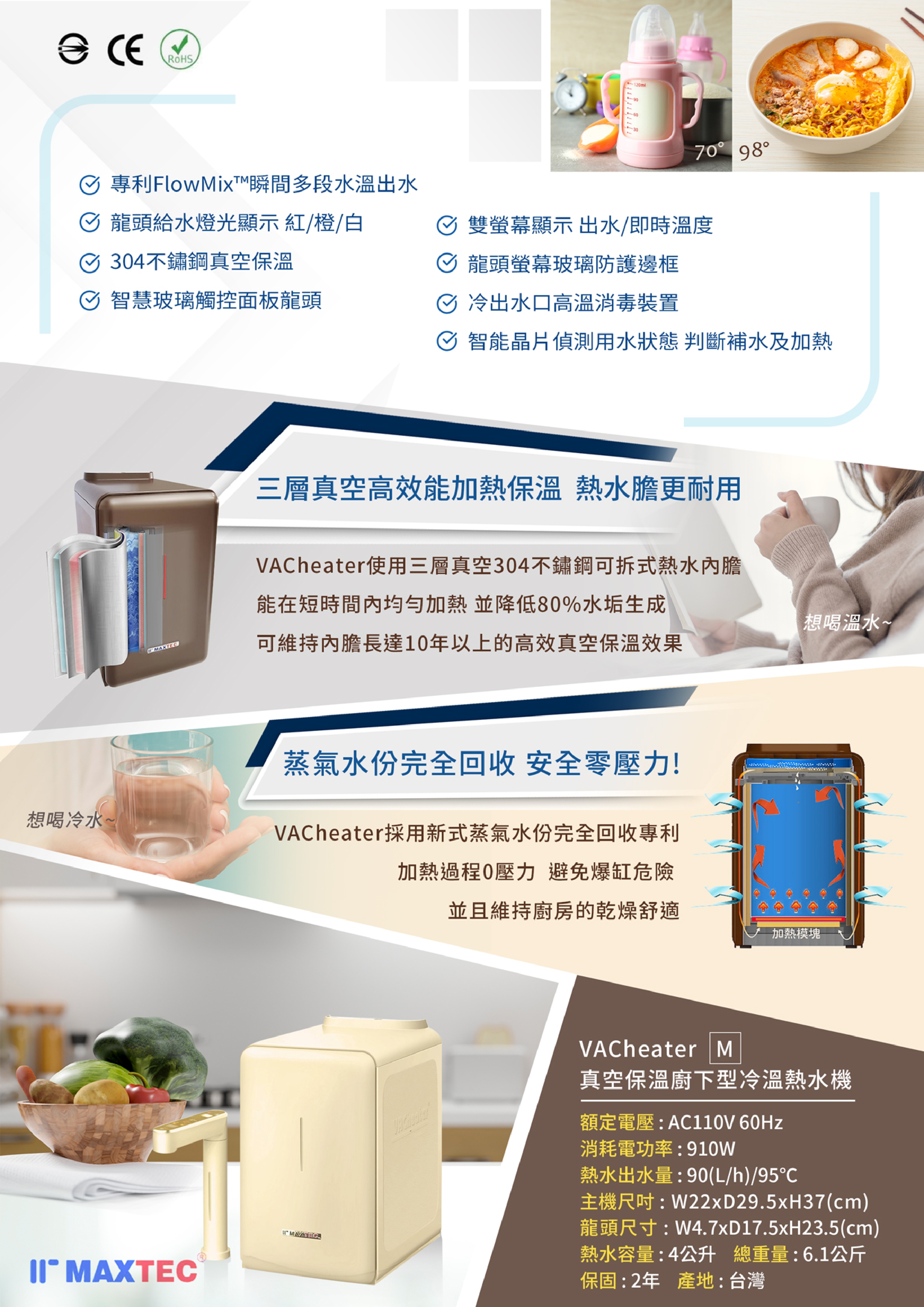 【蒸氣回收安全零壓力】 VACheater採用MAXTEC 最新式蒸氣水份完全回收專利科技。 加熱過程過程-0壓力-避免爆缸危險及維持廚房的乾燥舒適,降低前置淨水器受到回壓及溫度而受損。