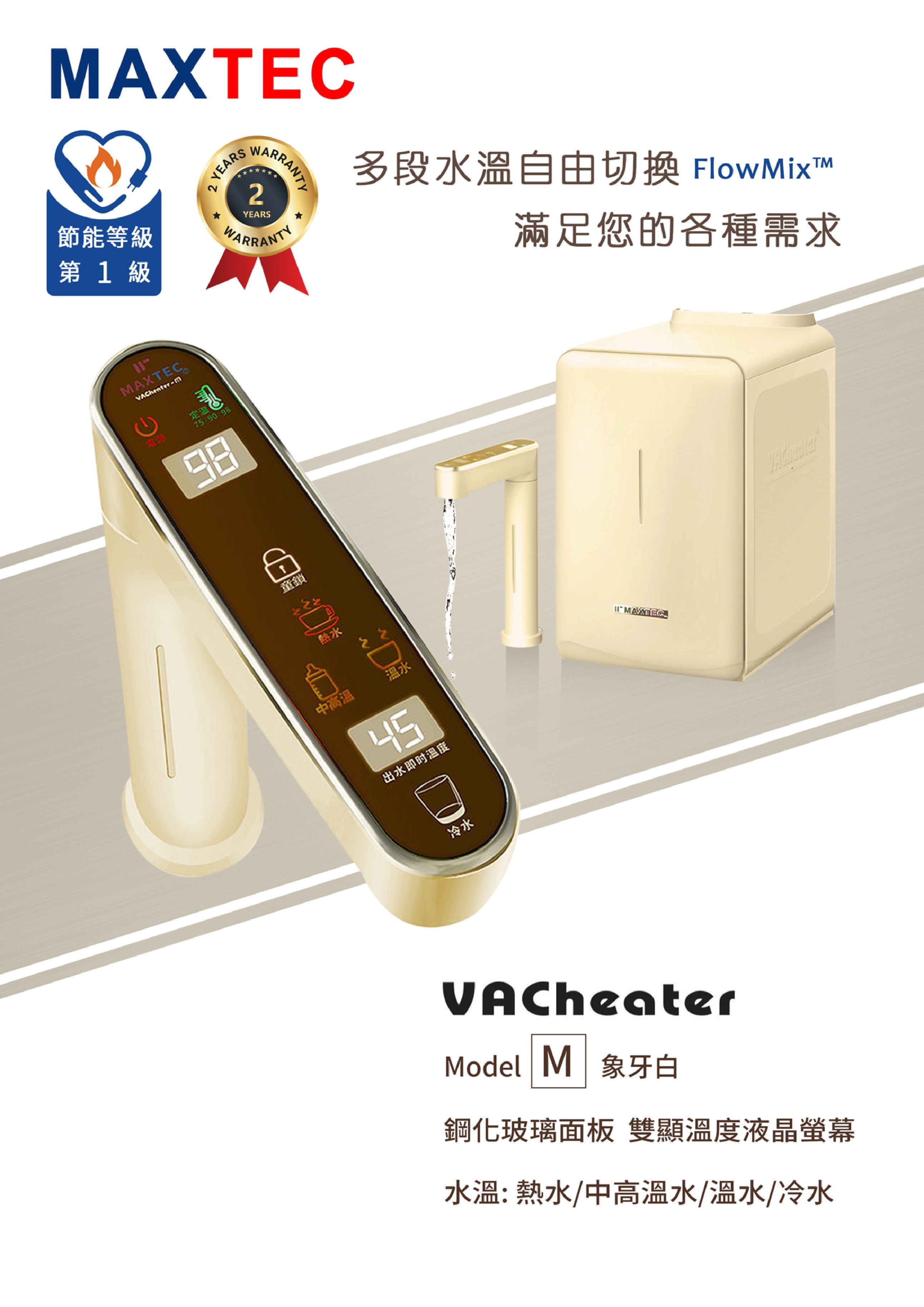 【提供多段溫度瞬間出水】 VACheater MAXTEC FlowMixTM専利科技提供多段溫度瞬間出水,直覺式觸控,一鍵滿足。多種水溫需求無需等待,可泡麵、沖泡牛奶(M/PLUS)、喝溫水、飲用冷水。