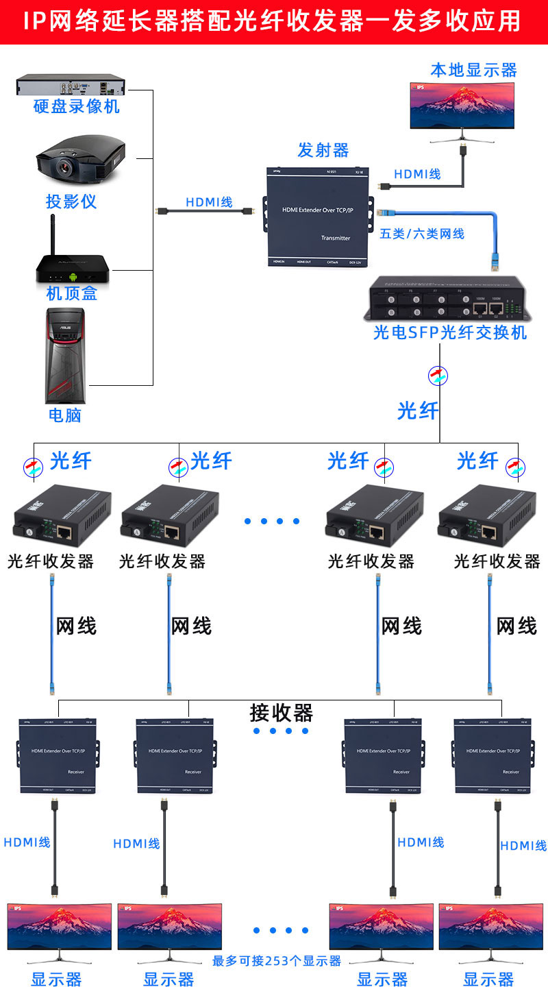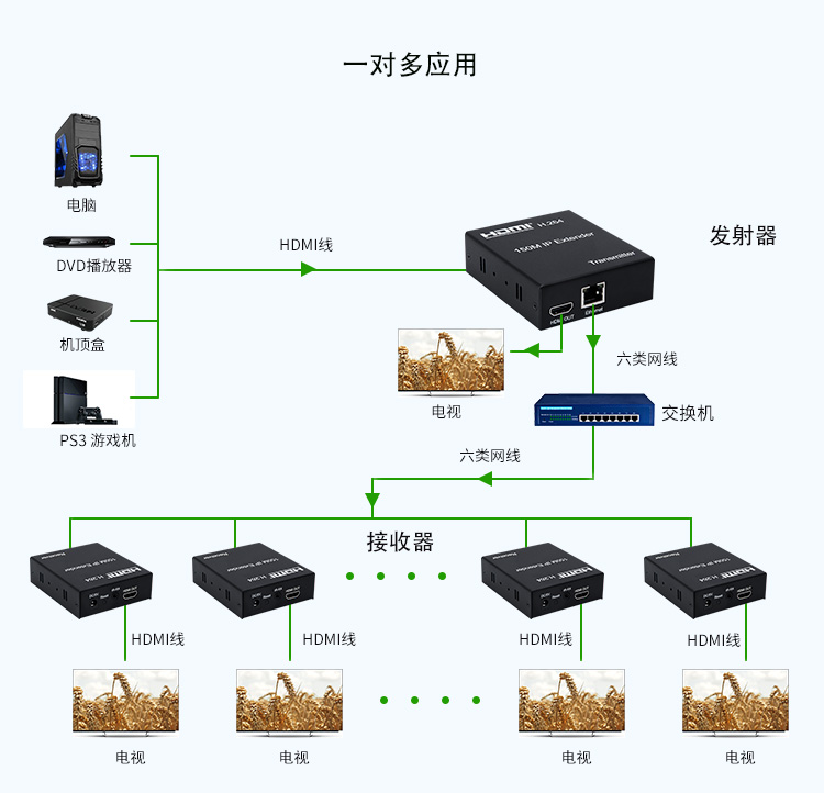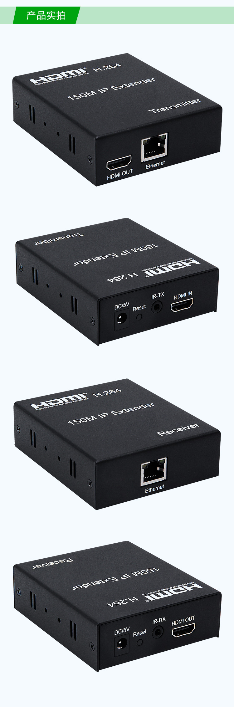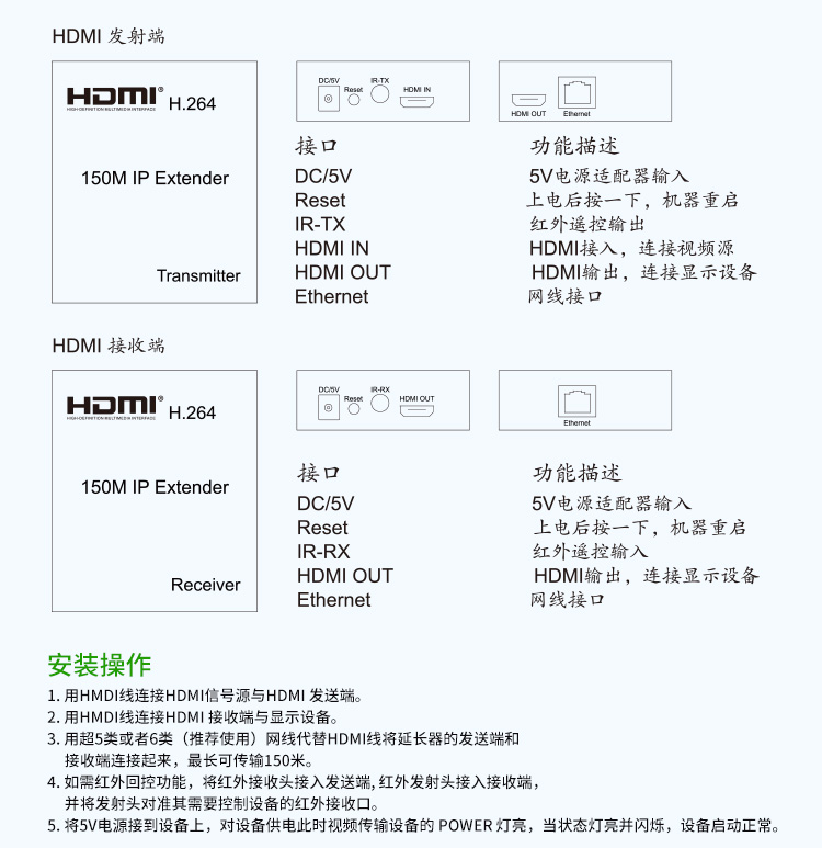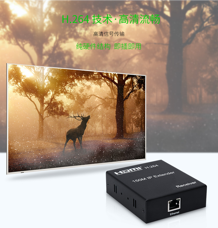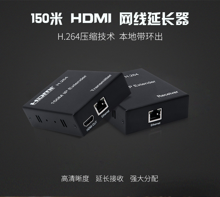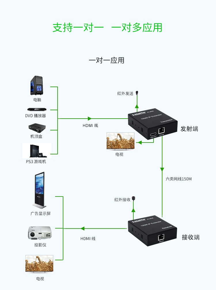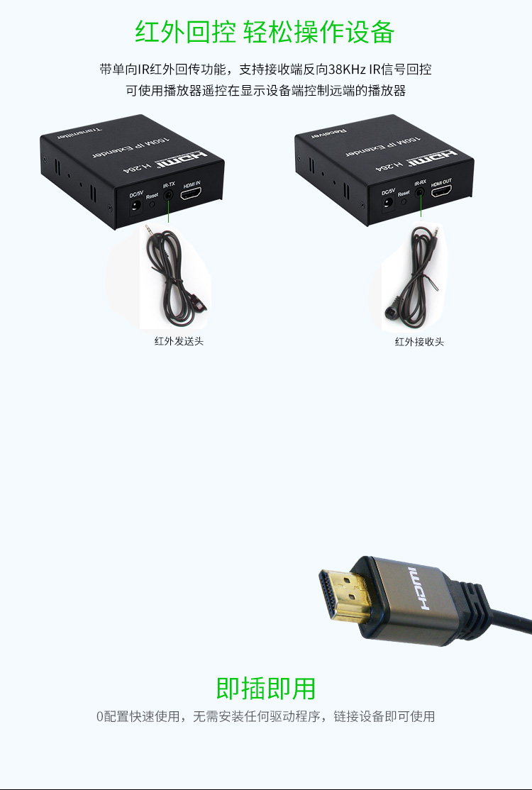 帶本地HDMI輸出,發射端可接顯示器,支持路由器,交換機一發多收,高清1080P,帶紅外IR回控(需要紅外遙控時可連接)