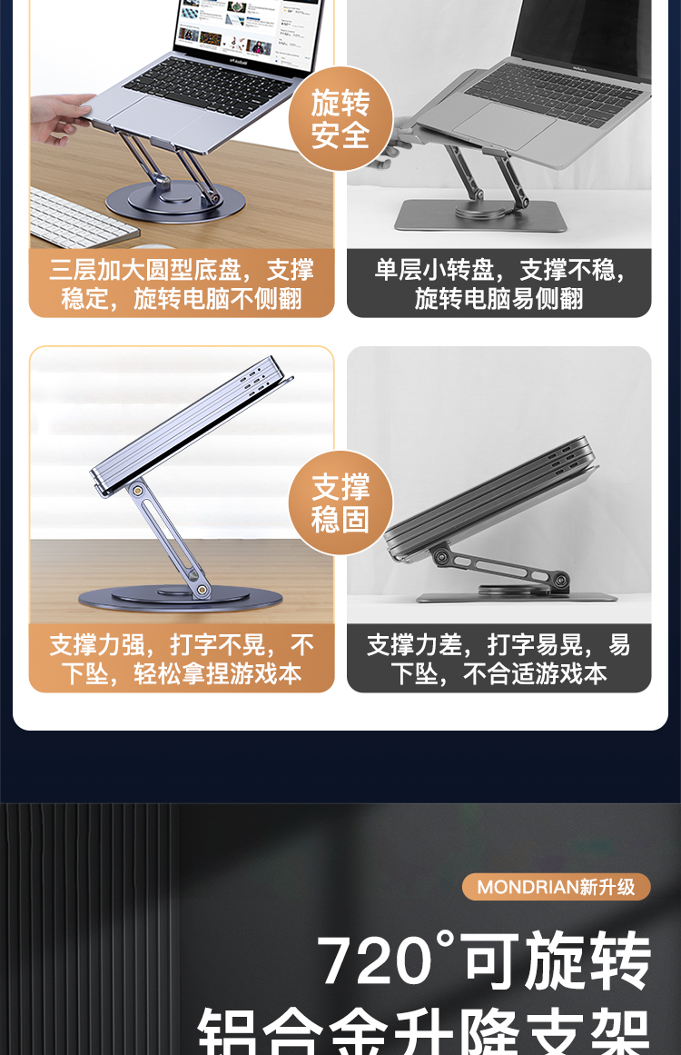 【720度可旋轉】MONDRIAN筆記本電腦支架托架桌面增高懸空升降鋁合金適用于蘋果macbook華為ipad平板散熱底座 筆電支架 4
