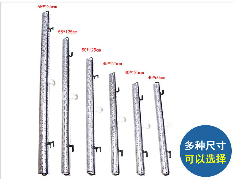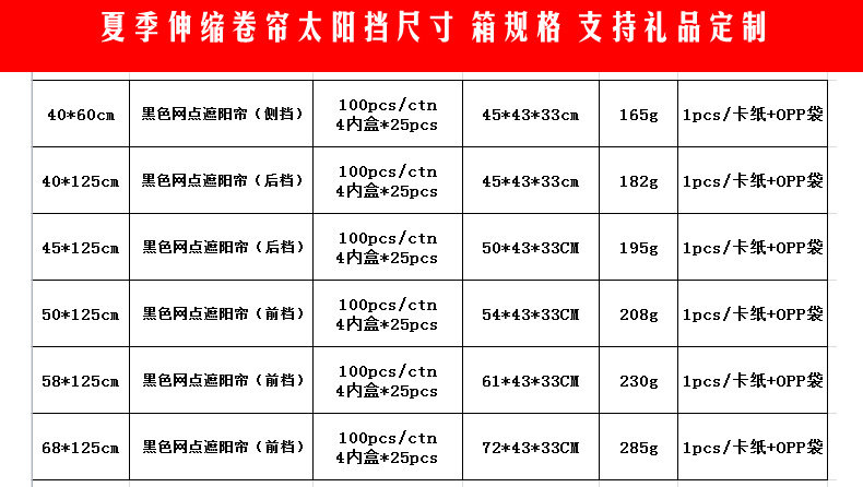 遮陽捲簾的常規尺寸有:40x60cm、40x125cm、50x125cm,58x125cm、68x125cm,對於大多數的車型來說,