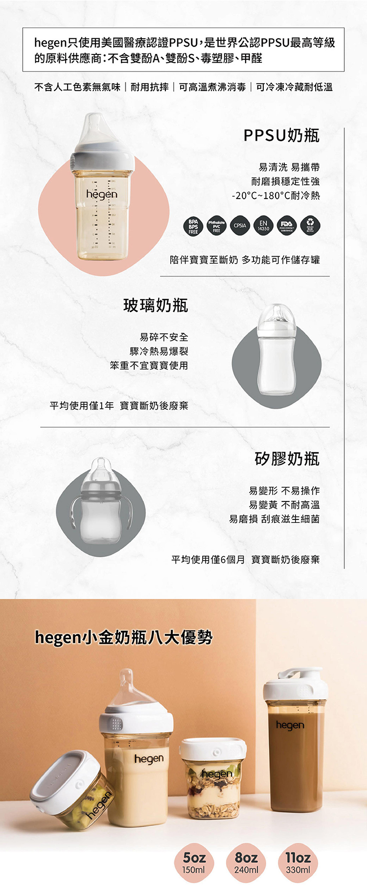 Hegen 金色奇蹟 PPSU多功能方圓型寬口奶瓶(60/150/240/330ml)【悅兒園婦幼生活館】